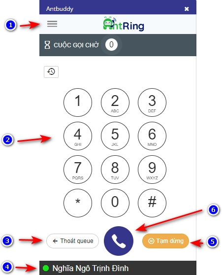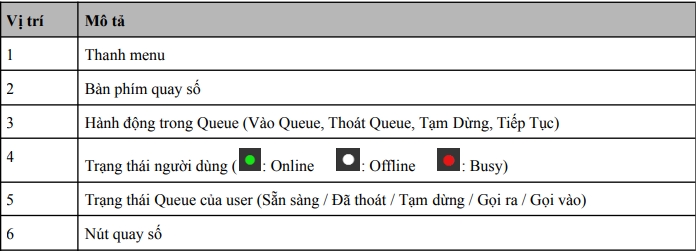 Đối với nhân viên trực điện thoại tiếp nhận cuộc gọi vào (nhân viên nhận đơn) cần thực hiện đăng nhập vào Queue (hàng đợi) để hệ thống đẩy cuộc gọi đến Callbar khi có khách hàng gọi vào. Các thao tác trên Queue bao gồm: (For a staff phone call who receives incoming calls (receiving staff) need to log in to the queue (queue) so that the system pushes incoming calls to the callbar when customer calls in. Operations on the Queue consist of:)