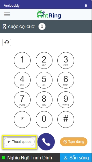 (2) Thoát Queue: thực hiện đăng xuất khỏi hàng đợi để không nhận cuộc gọi nữa (thực hiện ở cuối ca làm việc, trước khi thoát ứng dụng) bằng cách bấm vào nút