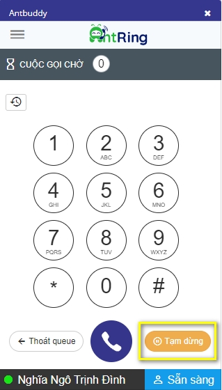 (3) Tạm dừng: thực hiện tạm dừng nhận cuộc gọi vào khi đang ở trong Queue (thực hiện khi cần xử lý việc khác không thể tiếp nhận cuộc gọi được) bằng cách bấm vào nút , hệ thống sẽ phát thông báo qua loa (tai nghe) và nút tạm dừng chuyển thành