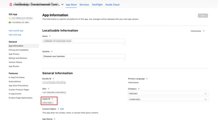 (1): Apple ID lấy bằng cách: Vào https://appstoreconnect.apple.com/apps -> chọn app cần tích hợp -> General -> App information -> General infomation