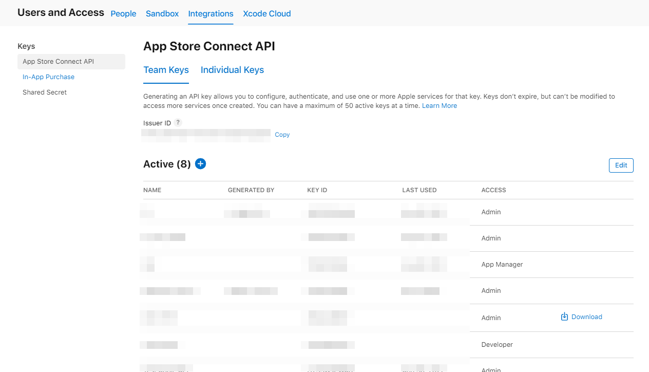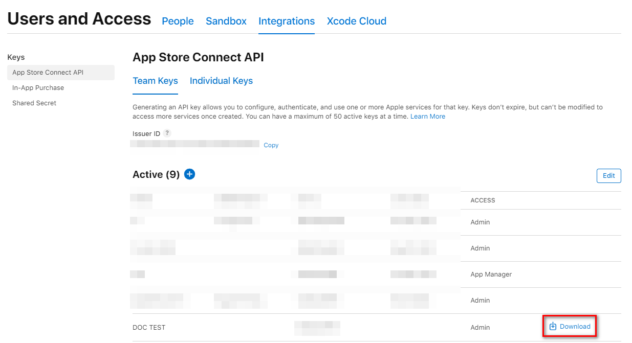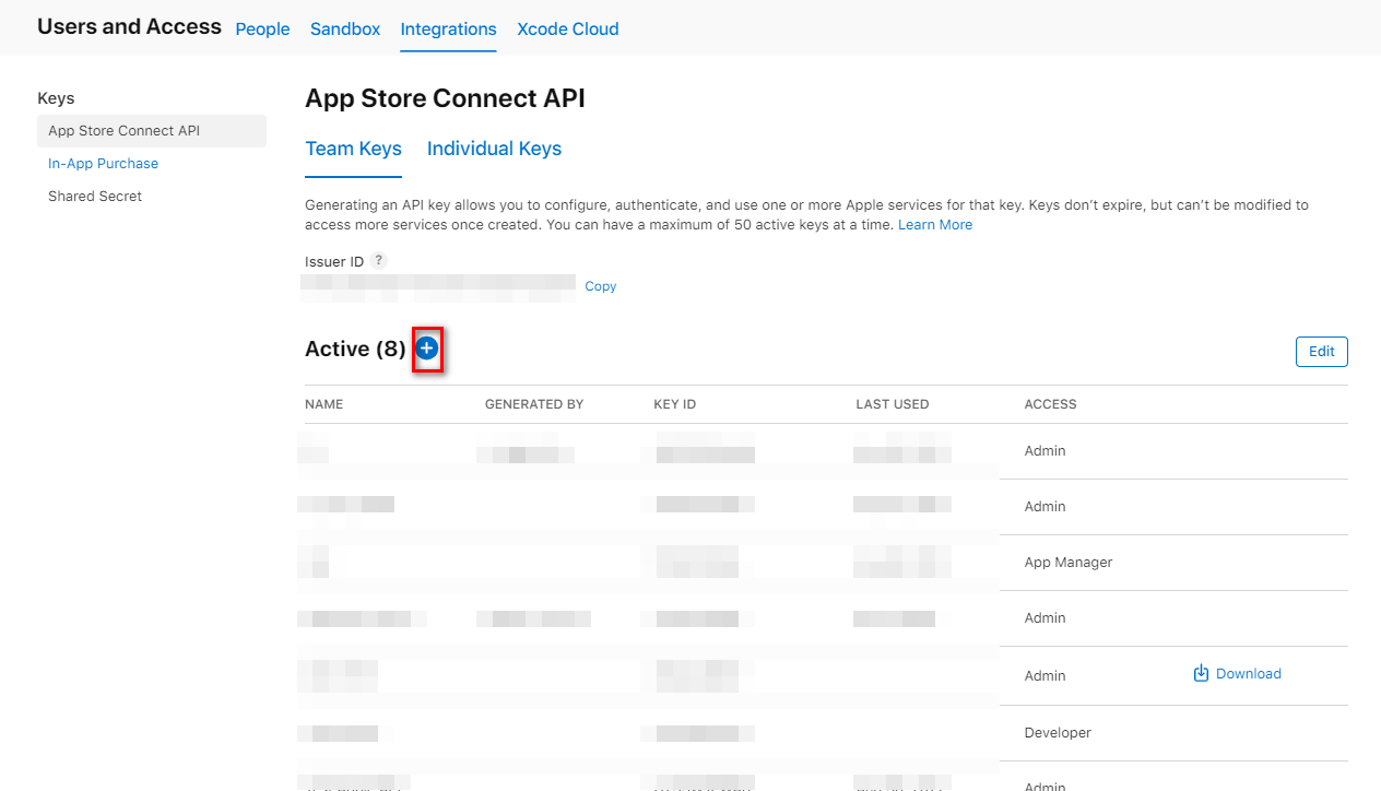 Bước 5: Chọn Keys -> App Store Connect API -> Team Keys