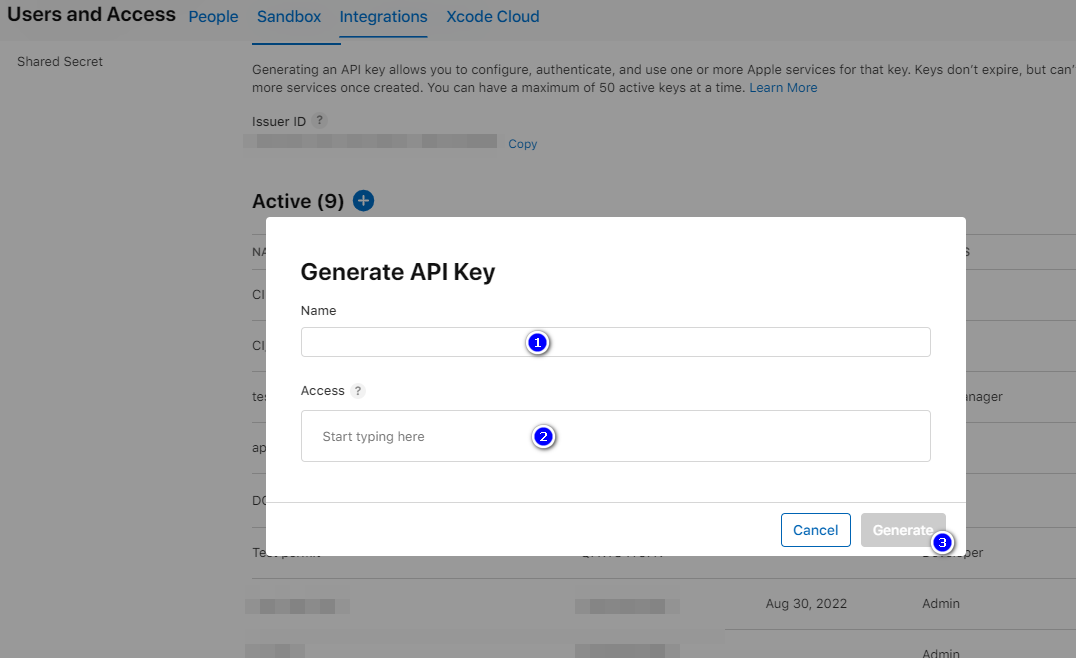 (1) Đặt tên (2) Chọn role access là Admin (3) Chọn Generate