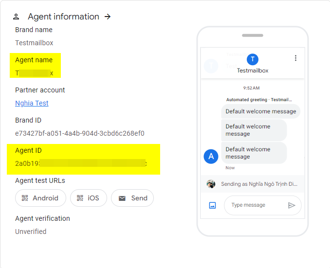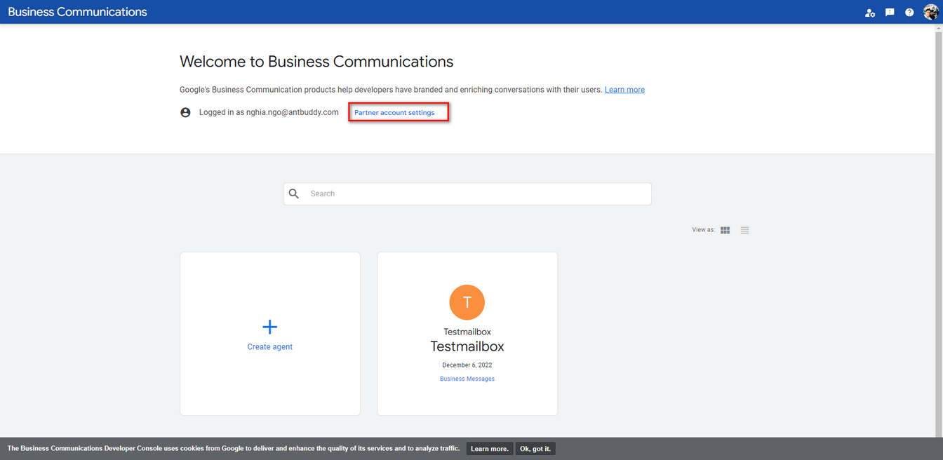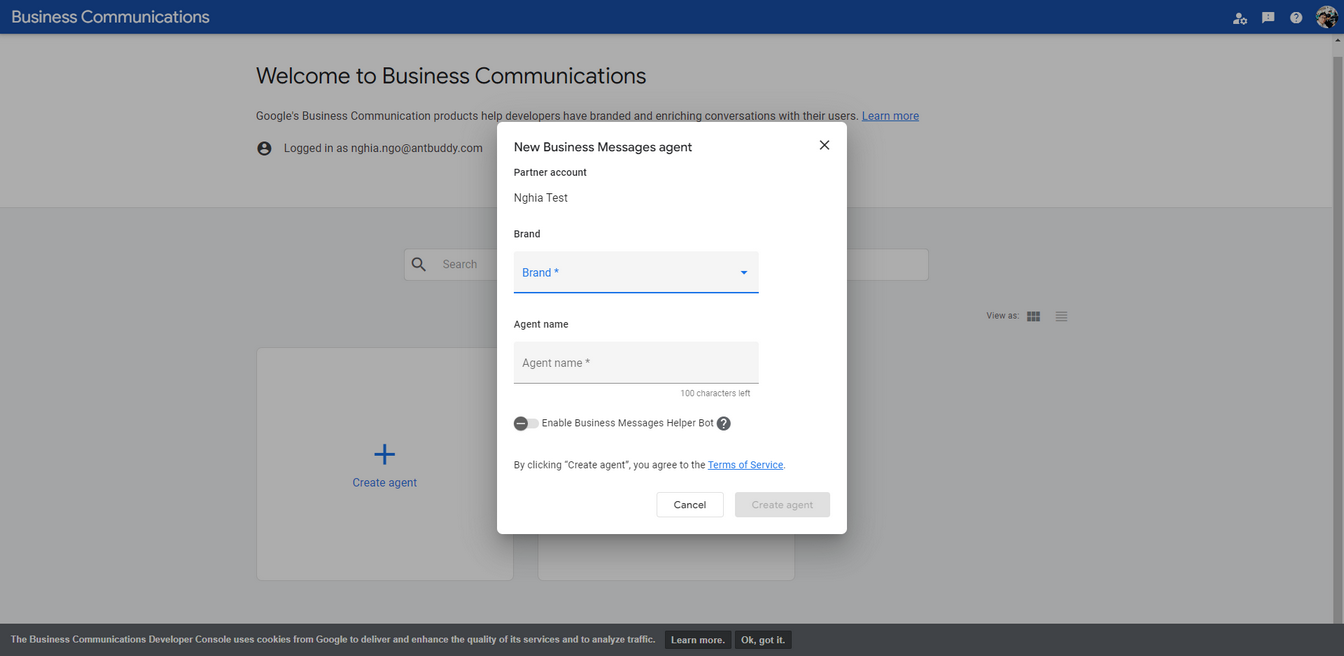 Bước 2: Tạo Brand và tạo agent tại trang https://business-communications.cloud.google.com/console/partner-console