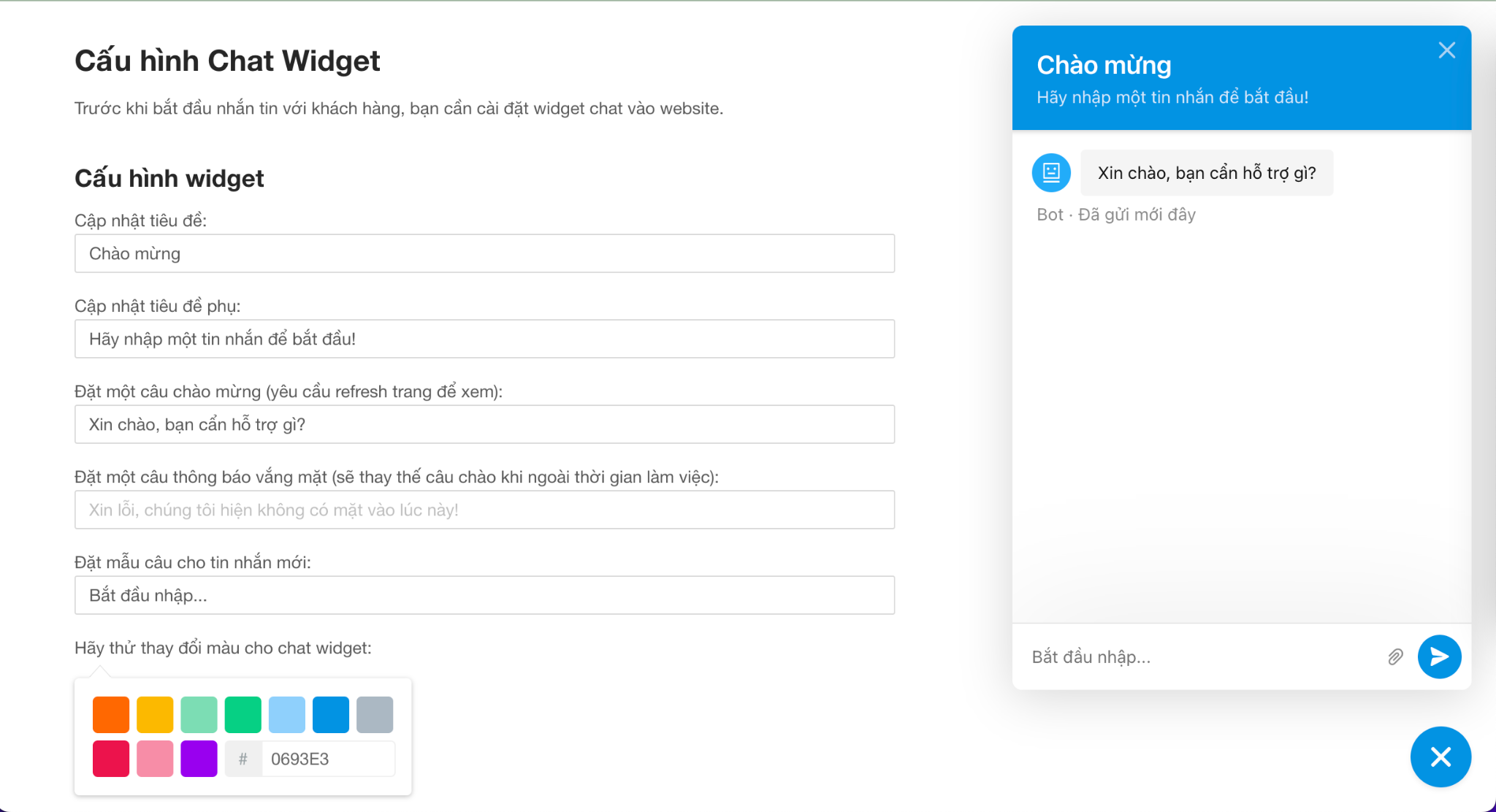 Tại đây, bạn có thể cấu hình được các tùy chọn riêng cho widget chat của bạn, cũng như để thiết lập widget chat lên website (Here, you can configure individual options for your chat widget, as well as set up the chat widget on your website.)