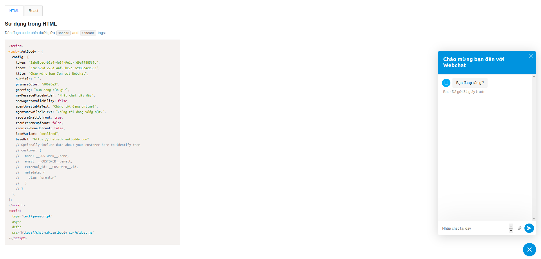 Để cài đặt widget chat lên website, bạn cần copy đoạn mã theo hướng dẫn trong giao diện ở widget chat (HTML/React) (To install a chat widget on your website, you need to copy the code according to the instructions in the chat widget interface (HTML/React).)