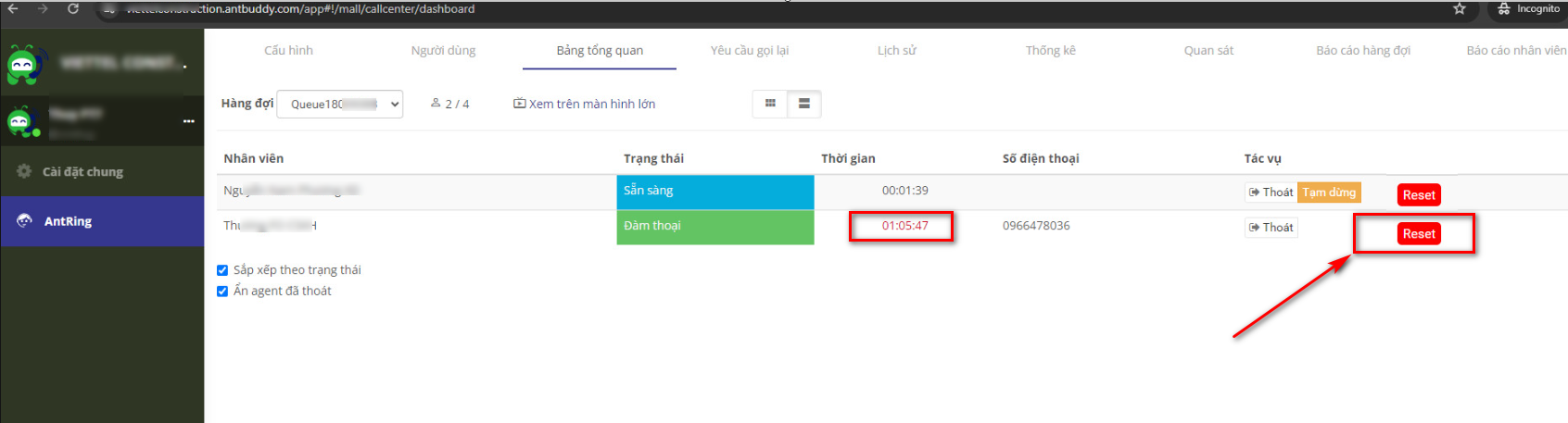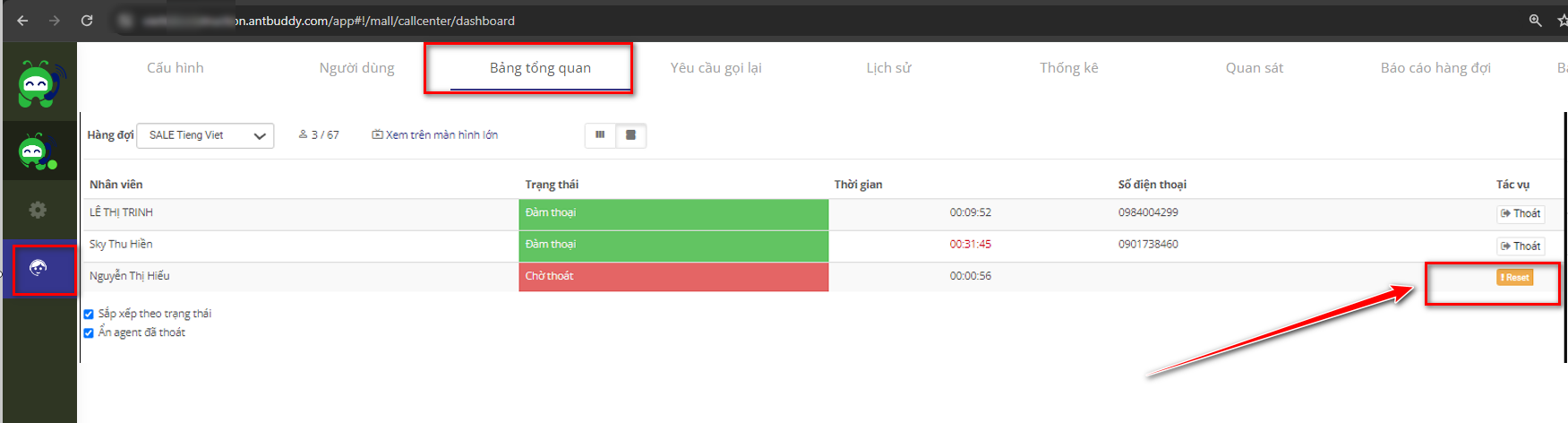 ⇒ Tư vấn viên liên hệ trưởng nhóm/ Admin để được hỗ trợ reset lại trạng thái hoặc báo CS AntBuddy để được hỗ trợ : Admin vào trang dashboard - Bảng Tổng quan để thao tác reset Link truy cập: https://<domain>.antbuddy.com/app#!/mall/callcenter/dashboard