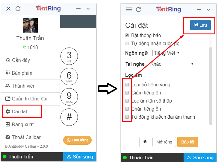 Trường hợp dùng tai nghe của điện thoại hoặc các loại tai nghe thường không hỗ trợ lọc tạp âm hoặc dùng loa ngoài của Lap thì thử TẮT chế độ Lọc âm trên phần Cài đặt của Callbar như hình: